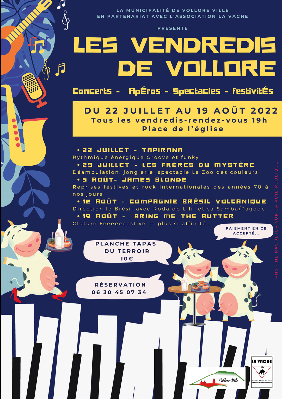 Les vendredis de Vollore – saison 2022 Mairie 19 juillet 2022 C’est la troisième édition … Les vendredis de Vollore reviennent. A partir de ce vendredi le 22 juillet. Programme complet ci dessous :